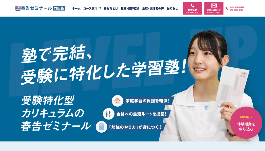 学習塾において大切なのは、「保護者からの信頼」です。そのため講師体制、教室情報、実績、塾生の声など、保護者の安心感につながる情報を整理し、入塾判断がしやすくなる情報設計を意識しました。